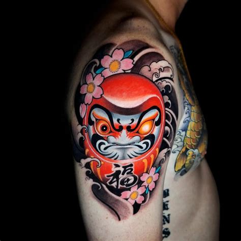The daruma is a japanese doll, traditionally made out of paper mache and without arms or legs. In addition to that, you can also add floral motifs or flowers to the tattoo. I love these little dolls.