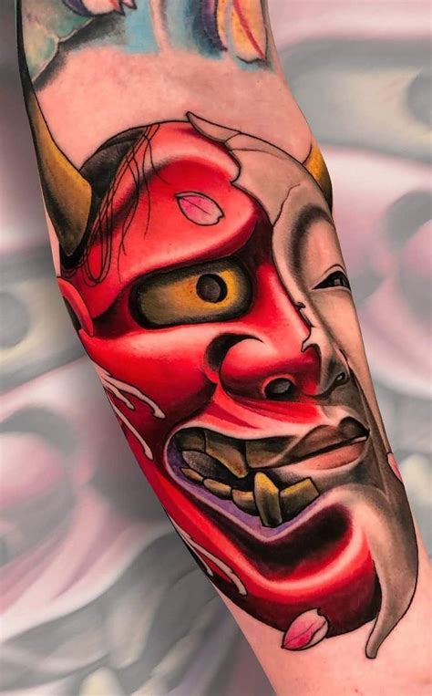 Below are a few examples of the hannya mask tattoo. However, some people choose to add some other symbolism or images with the hannya mask tattoo to either reinforce the symbolism or change it slightly. Like the hannya, waves are unpredictable. Hannya mask and cherry blossom tattoo The mask is surrounded by a sly serpent to give the design a.